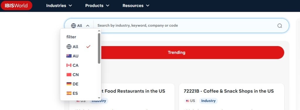 Provides detailed reports covering over 700 industries, spanning countries and regions worldwide. See screenshots for supported country coverage. Industries include agriculture, manufacturing, retail, services, technology, finance, healthcare, and more.